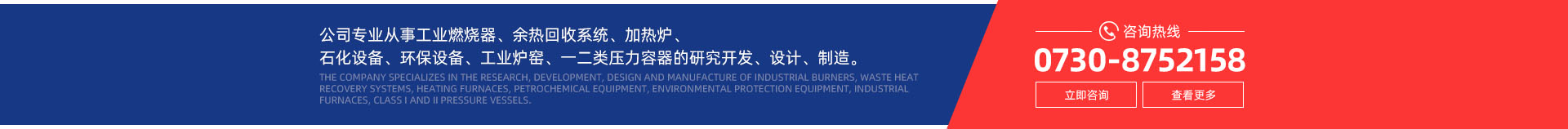公司專業從事工業燃燒器及其智能化控制系統、余熱回收系統、加熱爐及各類爐配件、石化設備及配件、環(huán)保設備、工業爐窯及其輔助設備配件、一二類壓力容器的研究開發(fā)、設計、制造。